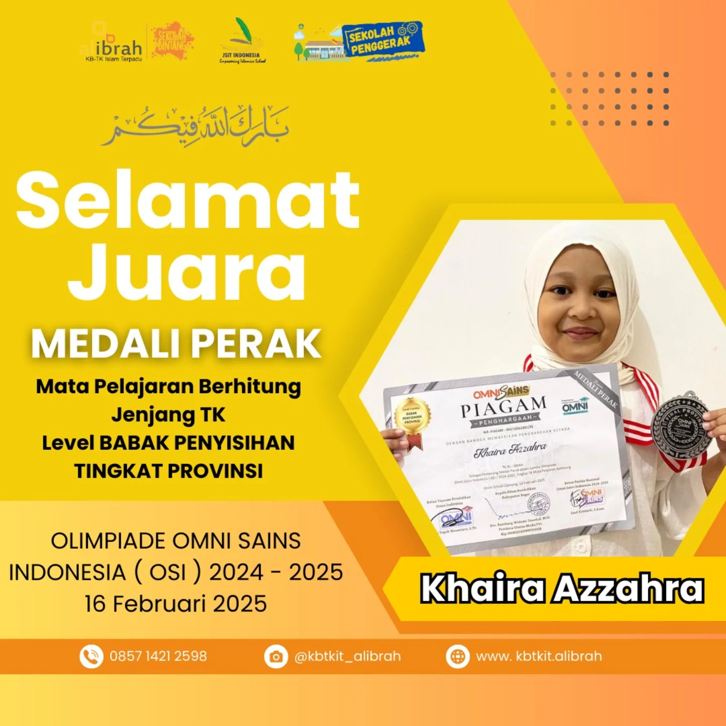 Prestasi kembali ditorehkan oleh santri KB-TK Islam Terpadu Al Ibrah Gresik. Kali ini, kabar gembira datang dari ananda Khaira Azzahra, yang berhasil meraih Medali Perak pada Olimpiade Omni Sains Indonesia (OSI) 2024–2025, bidang mata pelajaran Berhitung untuk jenjang TK tingkat Provinsi.